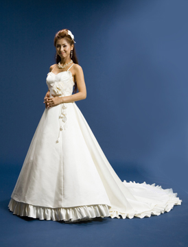 サテンの持ち味をマーガレットのイメージにあわせたAラインスタイルです。脚長効果をもたらすためのトップのバストサイドシャーリングとハイウエストですっきりとした花嫁を演出します。
