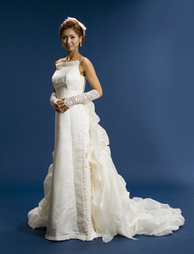 ミカドを使ったスレンダードレスです。両サイドに刺繍パネルを配した「横顔」にアクセントのあるモデルです。また、ボリュームたっぷりのタッキングトレーンは取り外し可能です。トレーンあるなしでまったく表情が異なるギャップのあるドレスです。