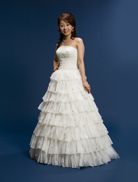 オーガンのクロスストライプと8段のティアードスカートにストーンを配したAラインスタイルです。花嫁を照らす光がストーンに反射し、存在感をさりげなくアピールします。歩くたびにゆれるティアードスカートが花嫁に動きをあたえるスタイルです。