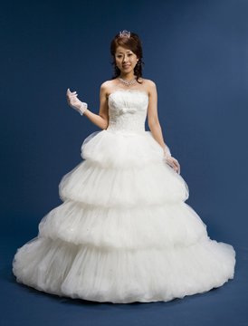 ビックバルーンスカートが特長的なプリンセススタイルです。胸下のリボンが脚長に見える効果をもたらし、ボリュームスカートをより引き立てます。ドレス全体にスパンコールが配されています。