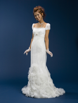 パフスリーブつきのスレンダーワンピースです。ドレス全体にかかるアコーディオンチュールから透けるレースの美しさが特長です。また、ひざ下にかかる遊び心たっぷりのスパイラルグチュールデザインがアクセントです。お揃いのベールとグローブ(ともに別売)でさらにキュートな雰囲気をかもし出します。