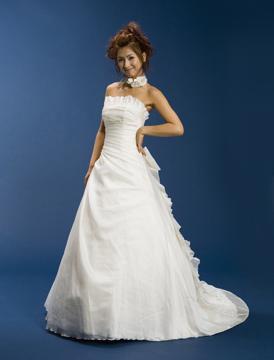 ニューオーガンの軽やかさを楽しめるシンプルAラインです。トップからつながるサッシュラインがドレスに表情を与えています。バックのリボンが愛らしさをプラスしています。