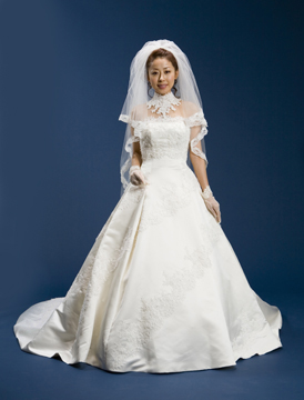 光沢のあるサテンとレース使いが個性的で存在感たっぷりのボックスプリーツスタイルです。スカートに施されたスパイラルレースデザインがアクセントです。ドレスをより引き立てるベール(別売)で、より華やかな花嫁を演出できます。