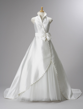 高級感溢れるミカド素材の素材感を存分に感じられるAラインドレス。凛としたイメージを演出するスタンドカラーは、現代社会でキャリアを積む働く女性、輝き続ける女性の感性にぴったりとフィットします。ウエスト部分には大きなリボンをあしらい、大胆にラウンドカットしたスカートラインがシャープな中にエレガントさをプラス。バックスタイルにほどこしたボックスプリーツがドレス全体に立体感を作り出します。洋服感覚で着る、新しいウエディングドレスを提案します。
