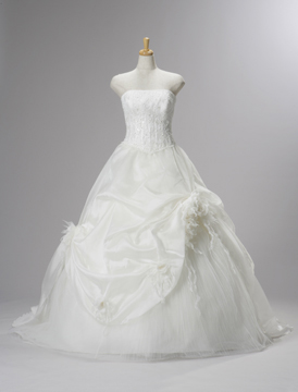 繊細なレースにビーディングしたビスチェと、新素材のオーガンジーに柔らかなラインを縁取られたエレガントなプリンセスドレス。ブラウジングしたスカートのしなやかなラインから覗くワッシャー加工のチュールがアクセント。