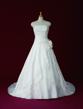 胸元のフリルとフラワーモチーフが可憐な雰囲気のプリンセスドレス。甘い表情のビスチェに組み合わせたシャープなカットのスカートサイドから覗く柔らかなプリーツが絶妙なバランスを生み出します。