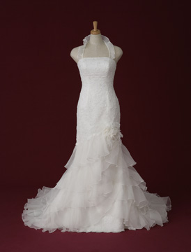 スカートのボリューム感とビーディングの美しさが目を引くプリンセルラインのゴージャスなドレス。胸元のプリーツとフリルが女性らしいやわらかな印象を与え、ウエストから大きく広がったボリュームスカートは主役こそ似合う一着。長いトレーンがホテルや教会といった大きな会場でもバックスタイルを引き立て、美しい後姿を演出します。いつの時代も愛される、クラシカルな美しさと女性の可愛らしさを併せ持つスウィートなドレスです。